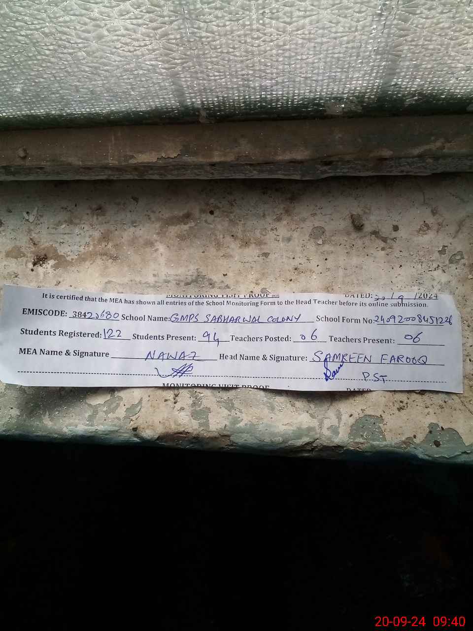| EMIS Code: 38420680 | Name of School: GMPS SABARWAL COLONY | |||