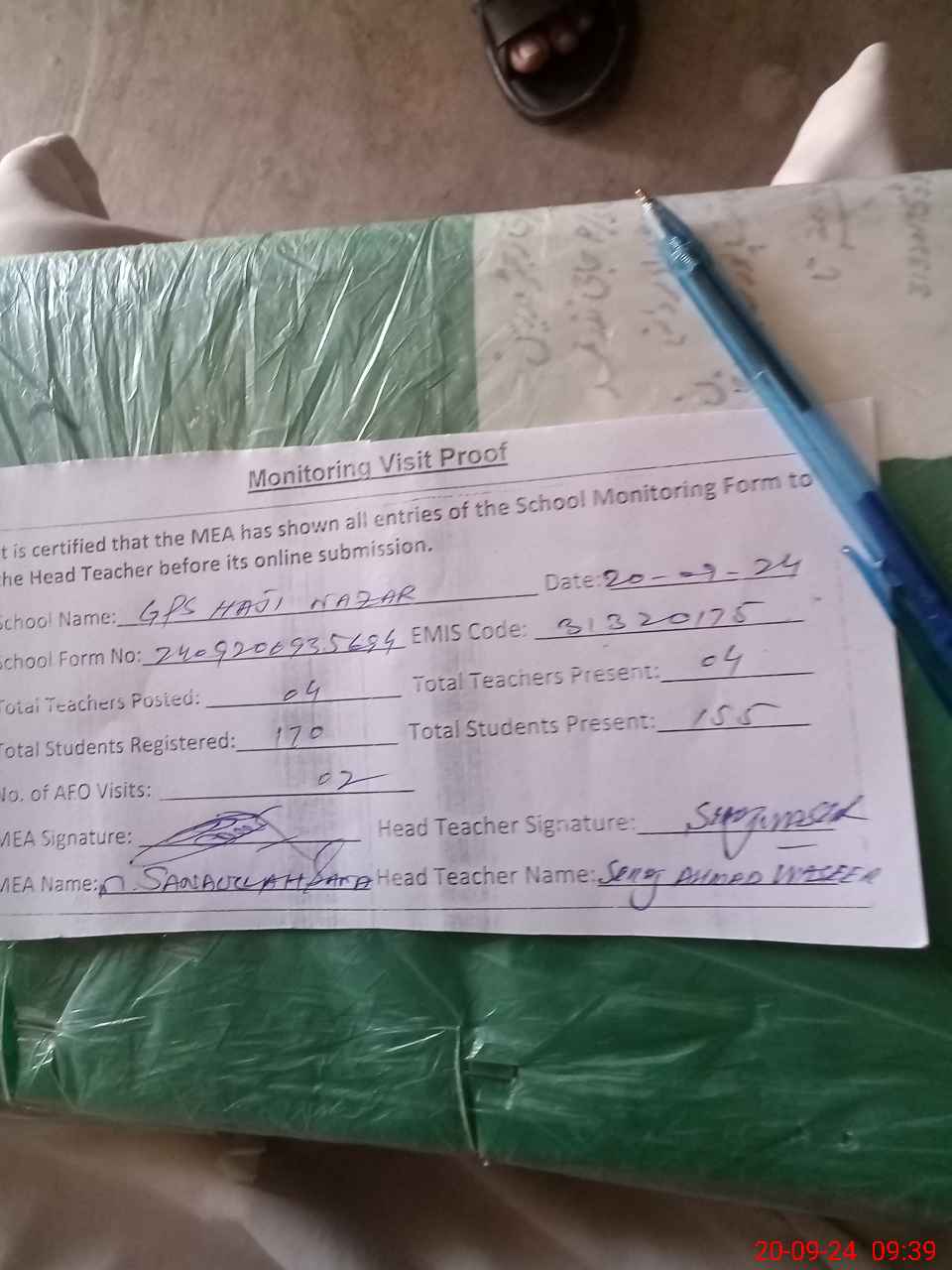 | Attendance Register | Head Teacher | MEA with School | Visit Proof |