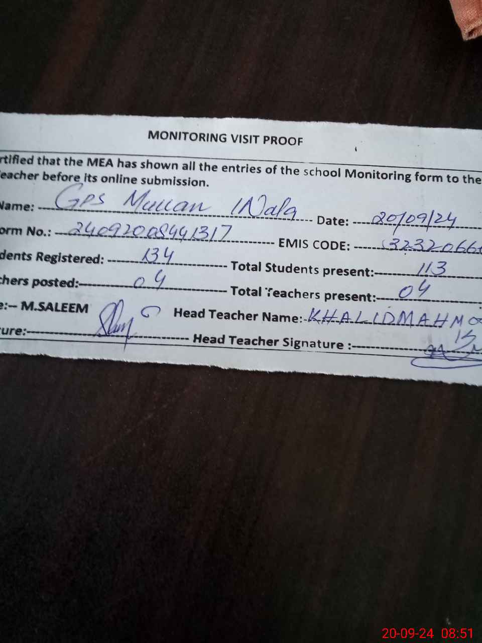 | EMIS Code: 32320666 | Name of School: GPS MULLAN WALA | |||