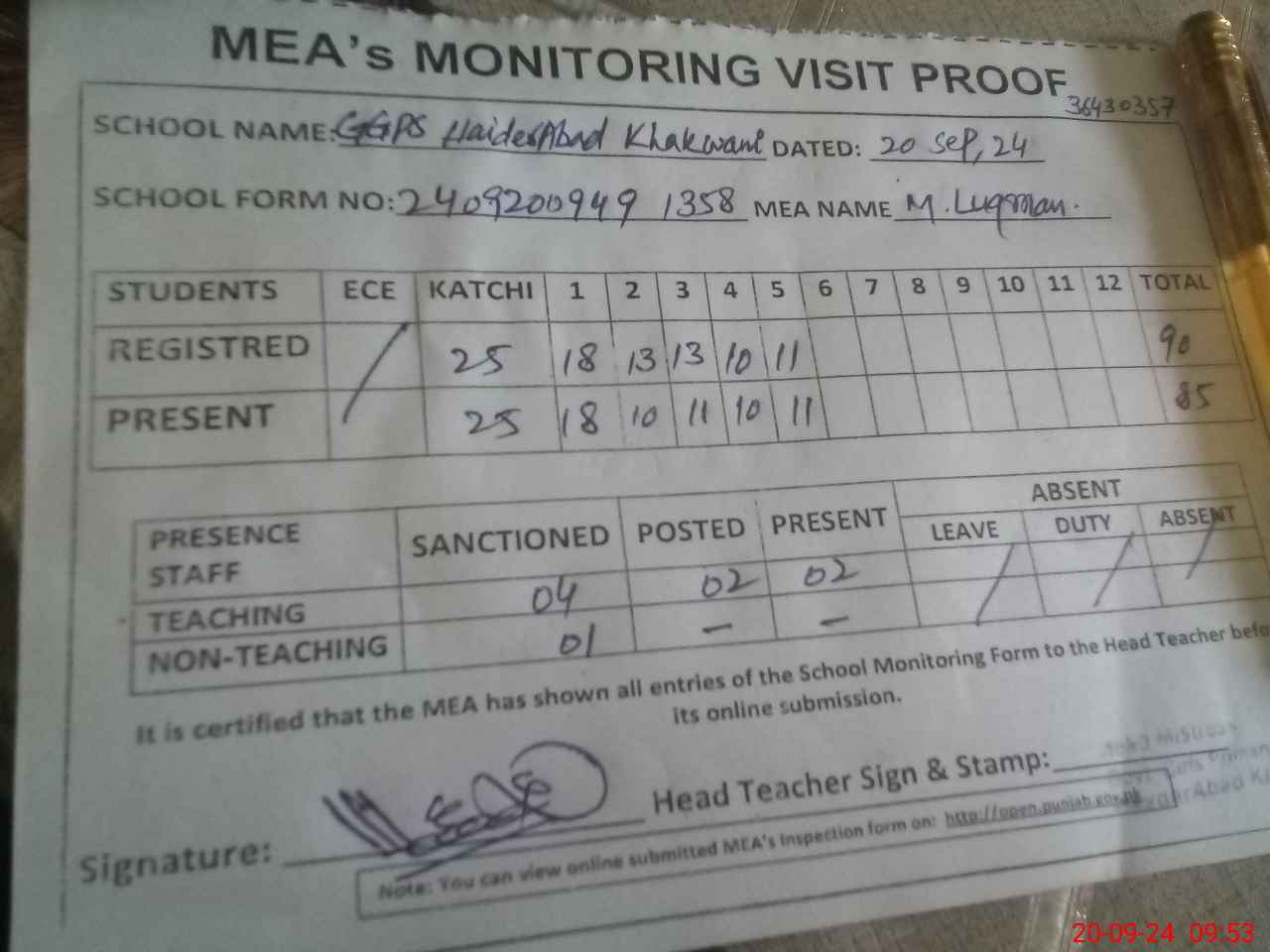 | EMIS Code: 36430357 | Name of School: GGPS HAIDER ABAD KHAKWANI, TULAMBA | |||