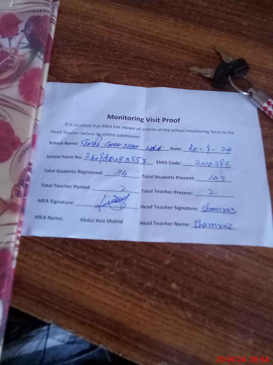 | Attendance Register | Head Teacher | MEA with School | Visit Proof |