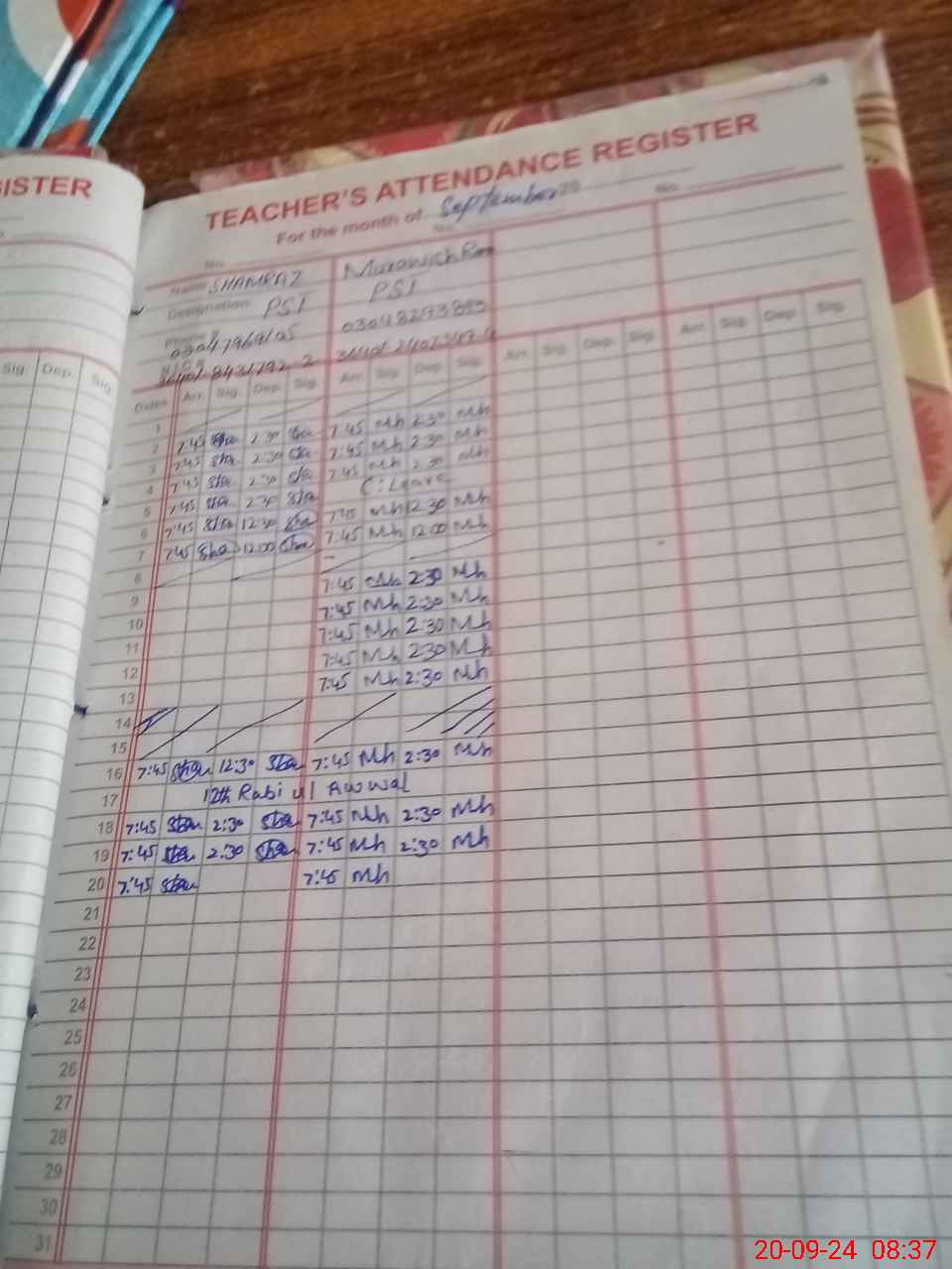| CNIC | Full Name | Designation | R/C | Absence During Last Calender Month |