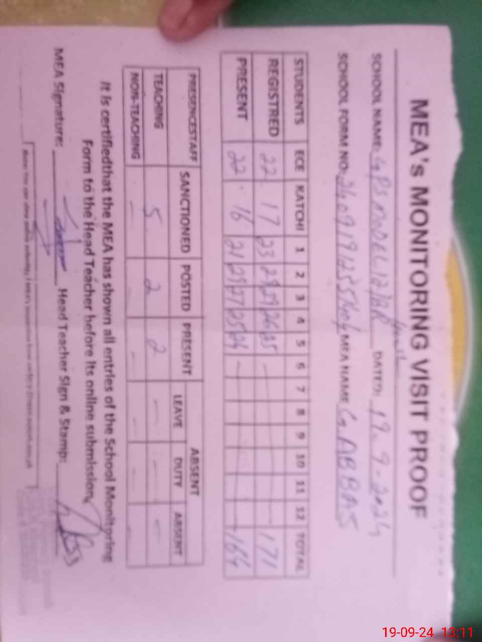 | Attendance Register | Head Teacher | MEA with School | Visit Proof |