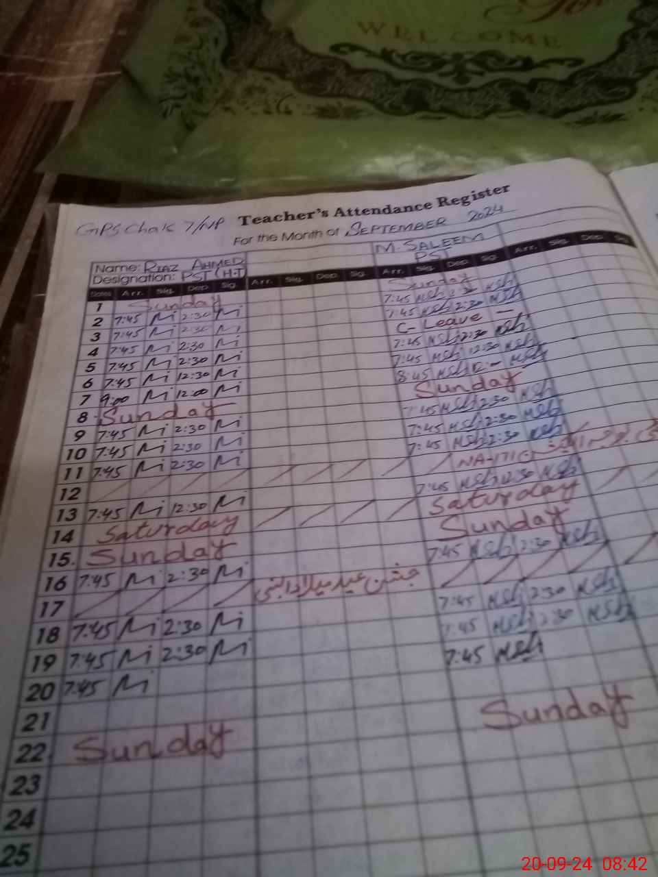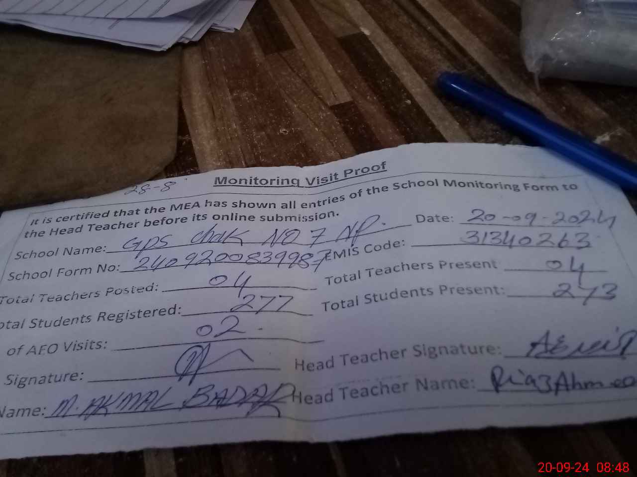| Attendance Register | Head Teacher | MEA with School | Visit Proof |