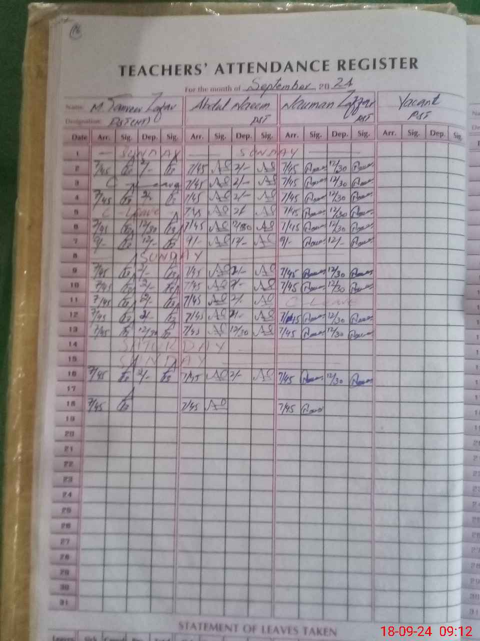 | Leave | Duty | Absent | Maternity | Medical | Ex- Pak |