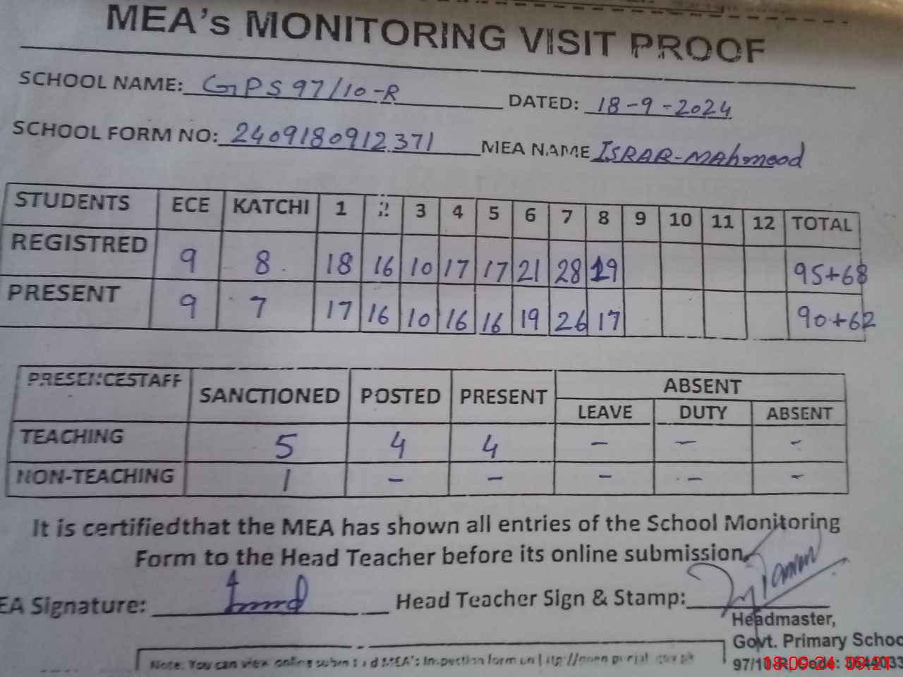 | Attendance Register | Head Teacher | MEA with School | Visit Proof |