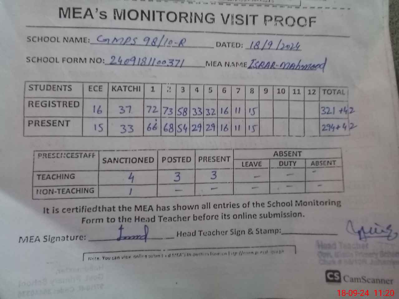 | Attendance Register | Head Teacher | MEA with School | Visit Proof |