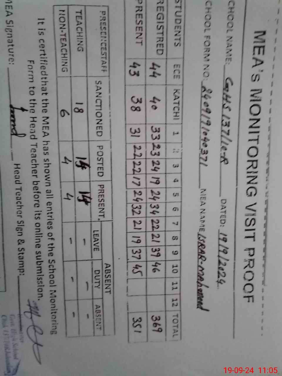 | Attendance Register | Head Teacher | MEA with School | Visit Proof |