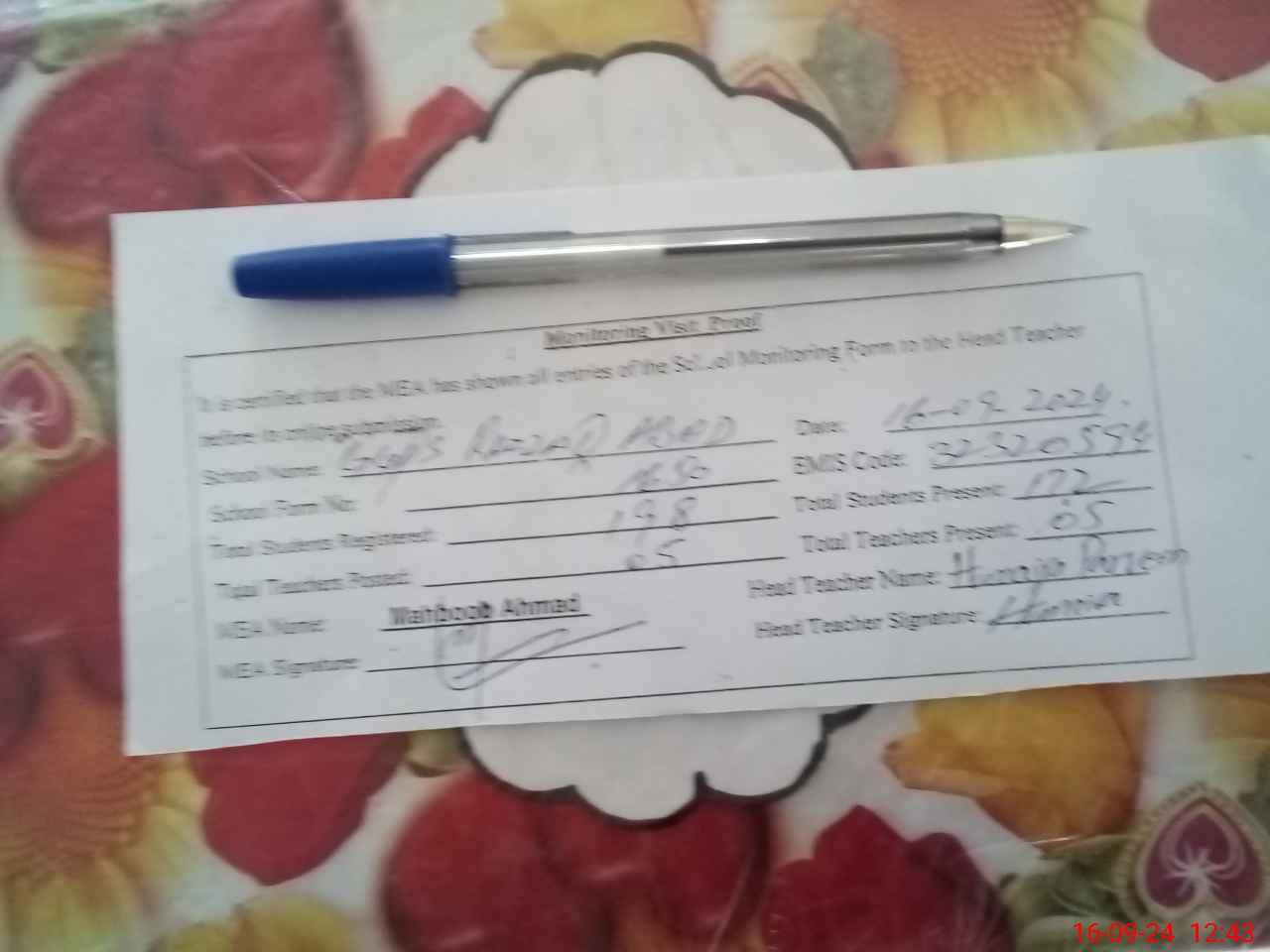 | Attendance Register | Head Teacher | MEA with School | Visit Proof |