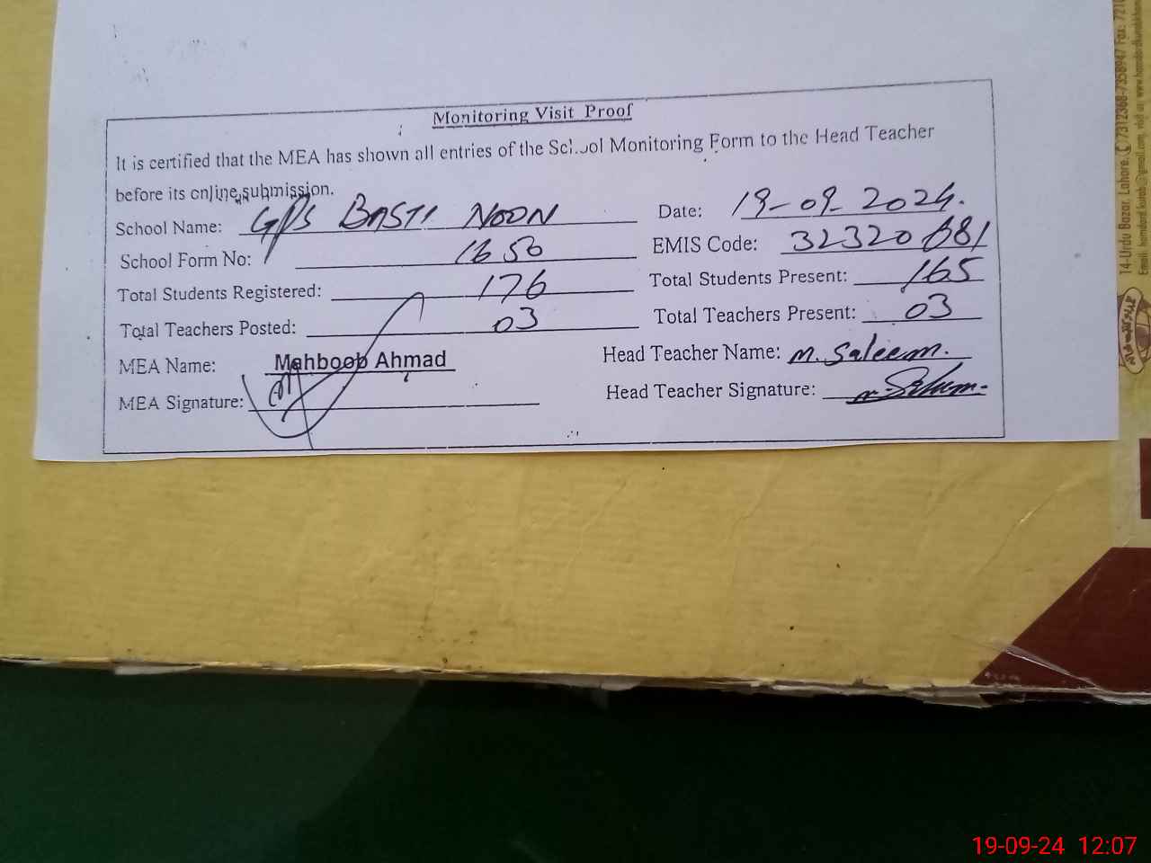 | Certified that this School was Inspected by the Undersigned MEA/DMO Today and the Information Stated Above is as Per Record. | |||||
