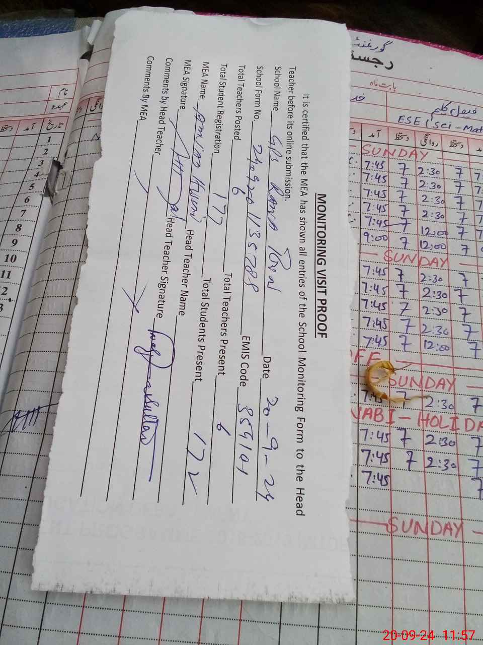 | Attendance Register | Head Teacher | MEA with School | Visit Proof |