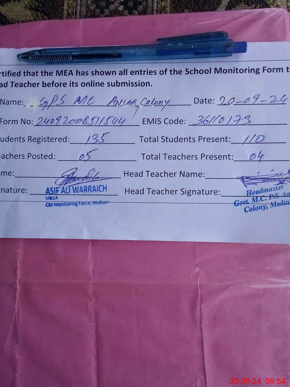 | EMIS Code: 36110173 | Name of School: GPS MC ANSAR COLONY BUDHLA ROAD MULTAN | |||