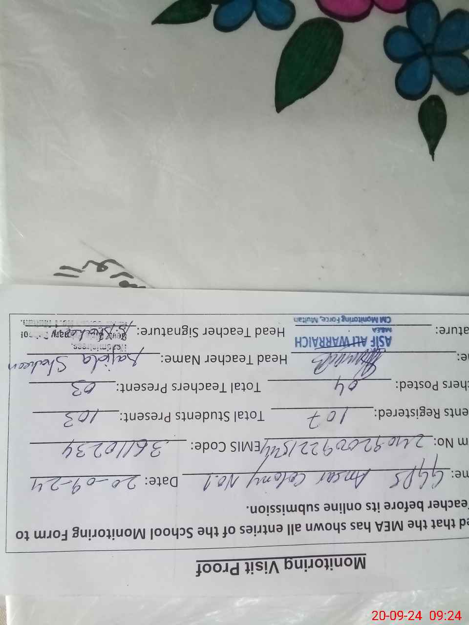 | EMIS Code: 36110234 | Name of School: GGPS ANSAR COLONY NO.1 MULTAN | |||