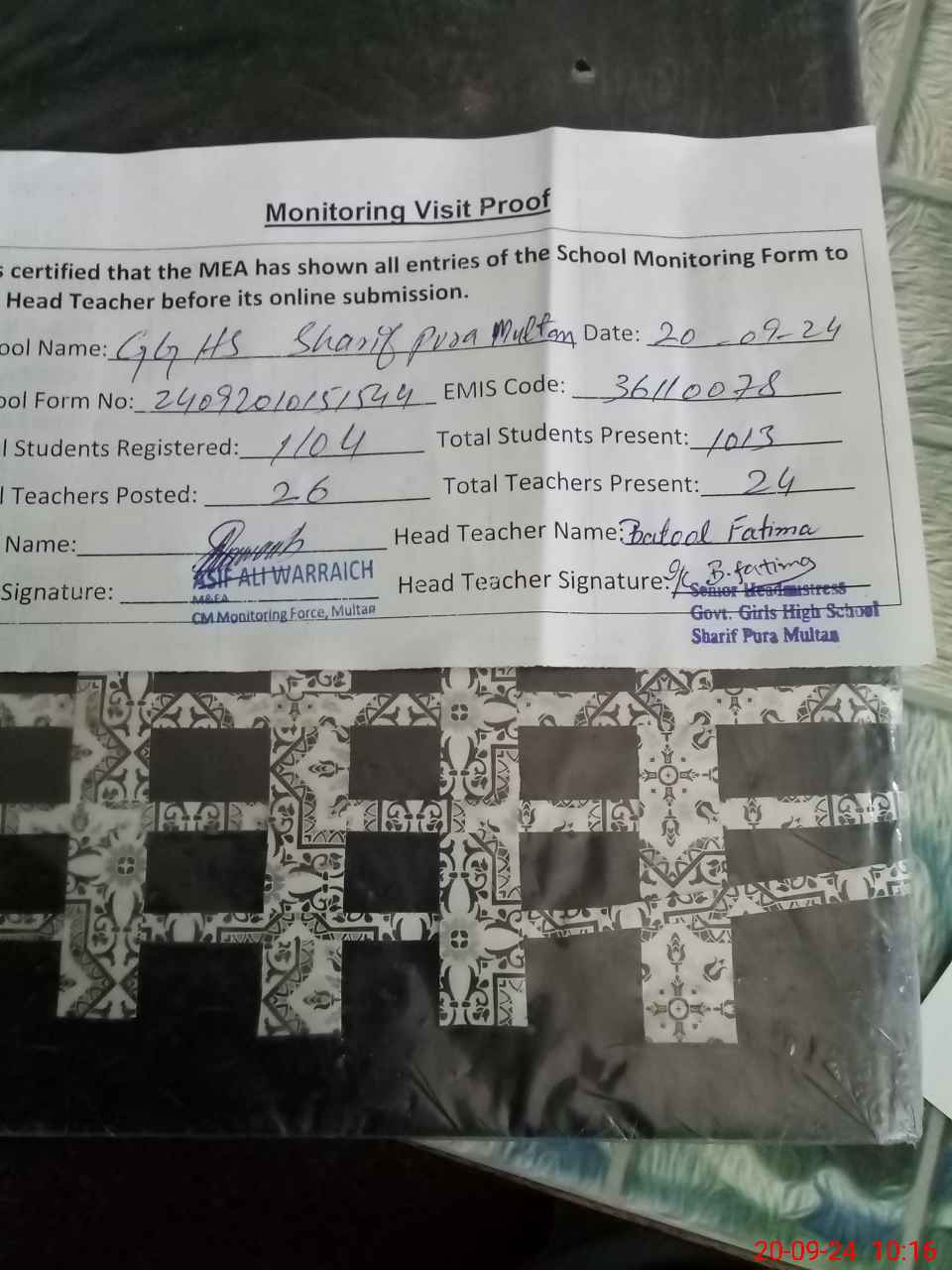 | EMIS Code: 36110078 | Name of School: GGHS SHARIF PURA MULTAN | |||