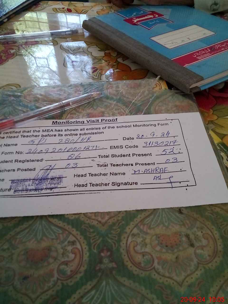 | EMIS Code: 31130217 | Name of School: GPS CHAK NO 280 HR | |||