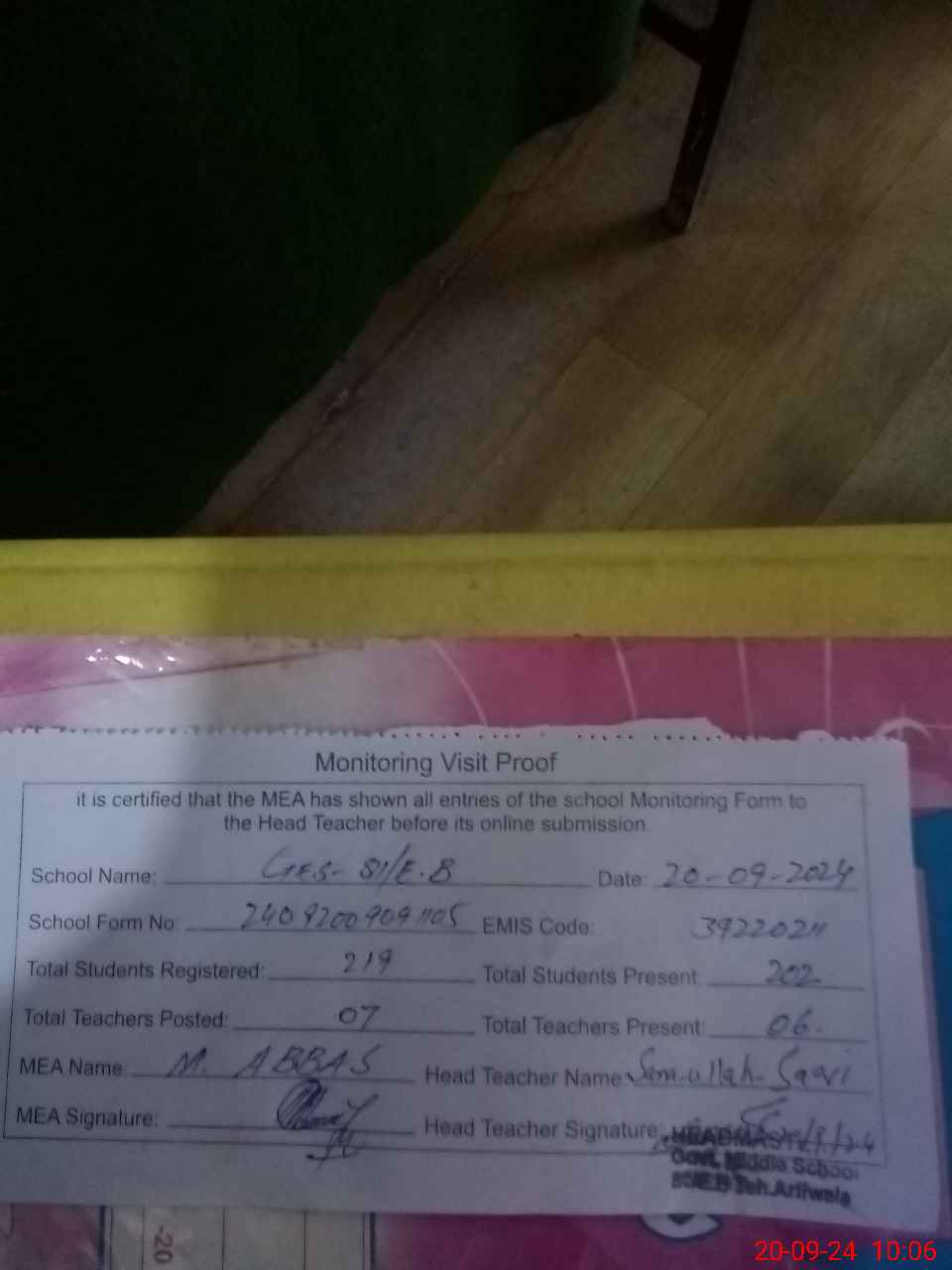 | Certified that this School was Inspected by the Undersigned MEA/DMO Today and the Information Stated Above is as Per Record. | |||||
