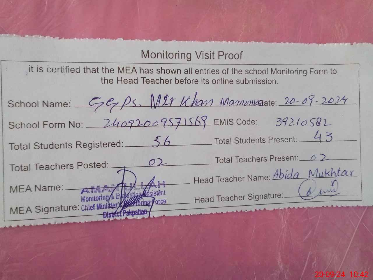 | EMIS Code: 39210582 | Name of School: GGPS MIR KHAN MAHMOONKA | |||