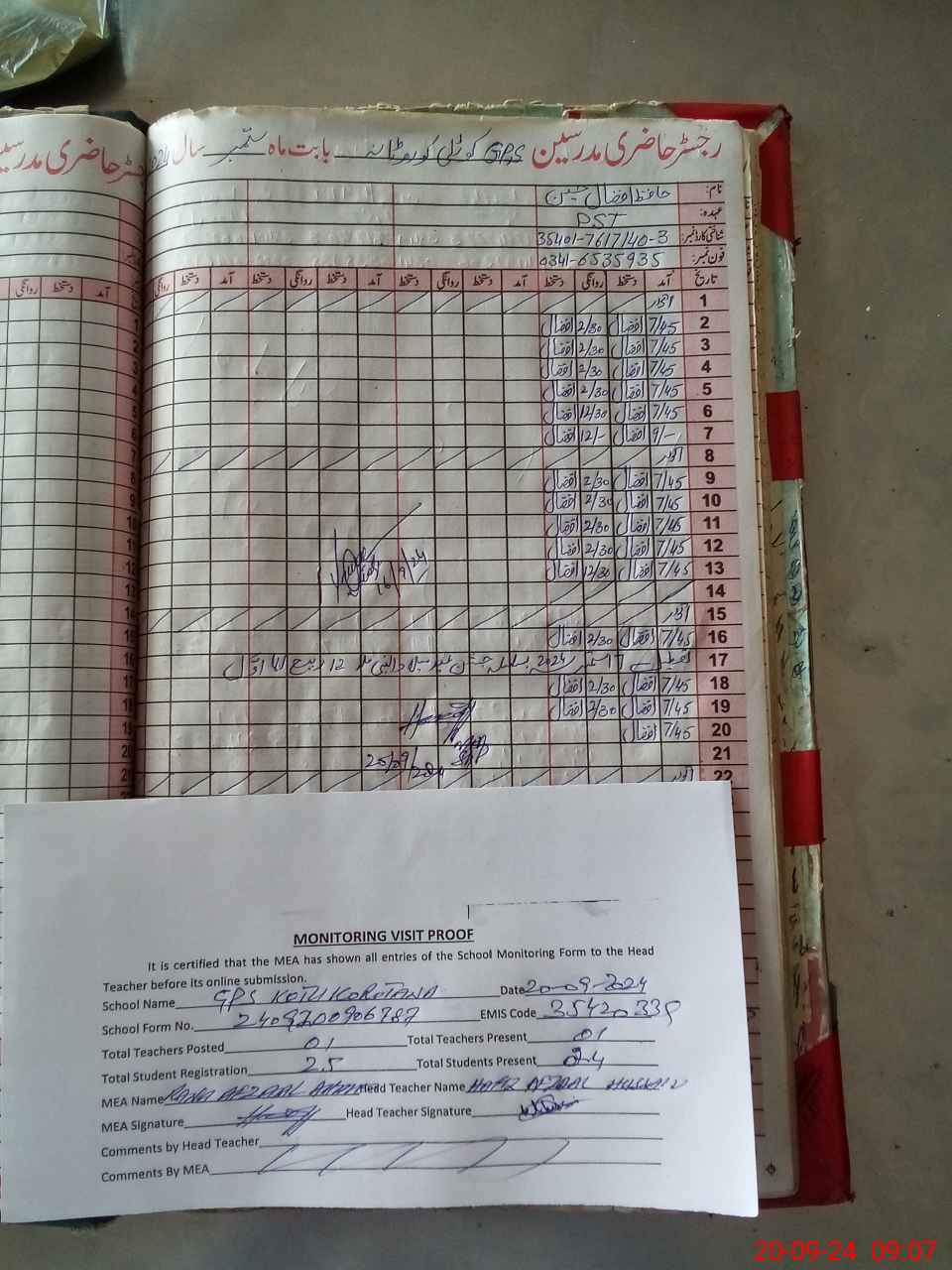 | Attendance Register | Head Teacher | MEA with School | Visit Proof |