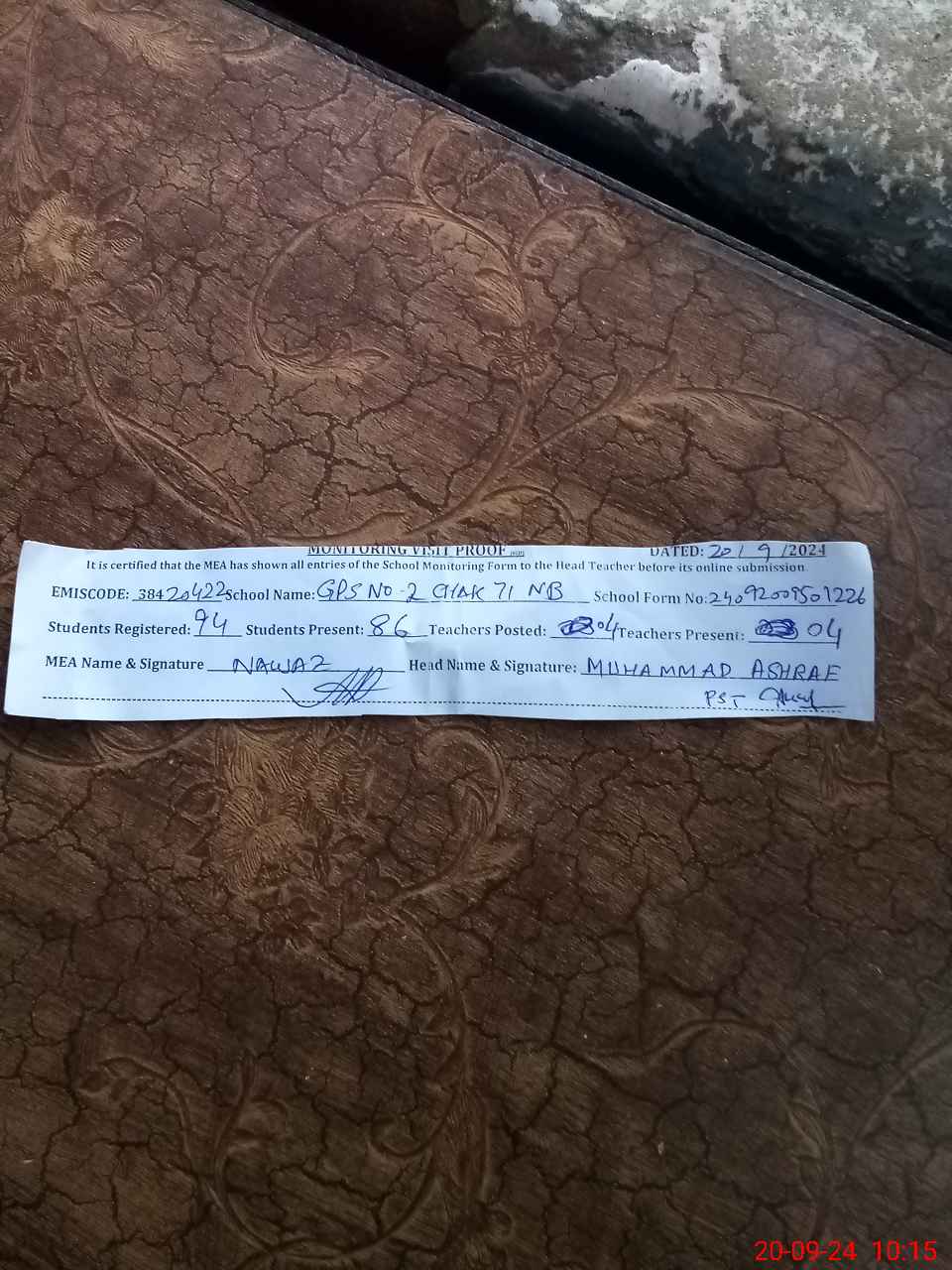 | EMIS Code: 38420422 | Name of School: GPS NO.2 CHAK NO.71 NB | |||