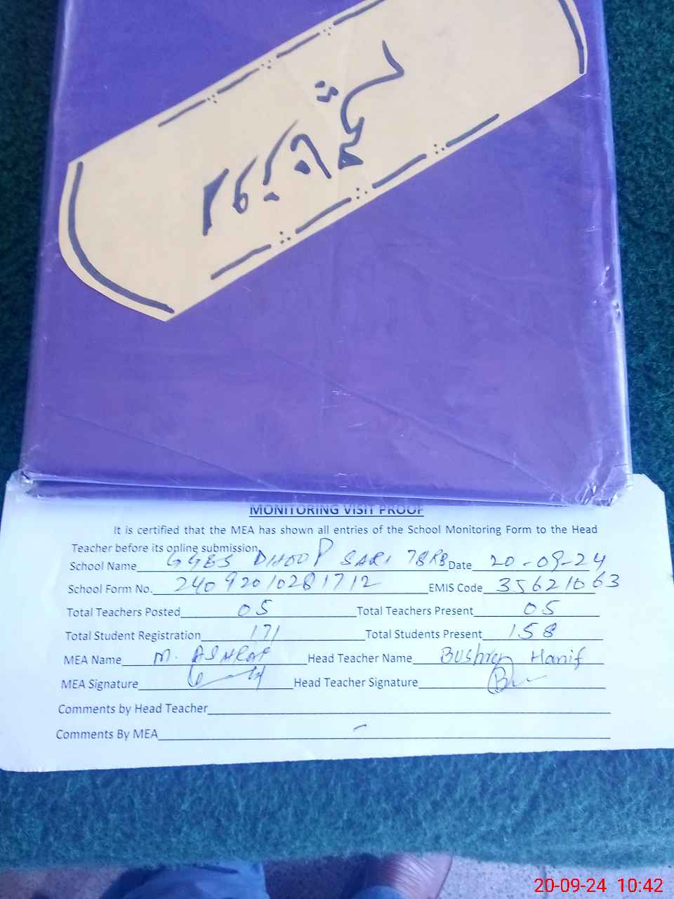 | Attendance Register | Head Teacher | MEA with School | Visit Proof |