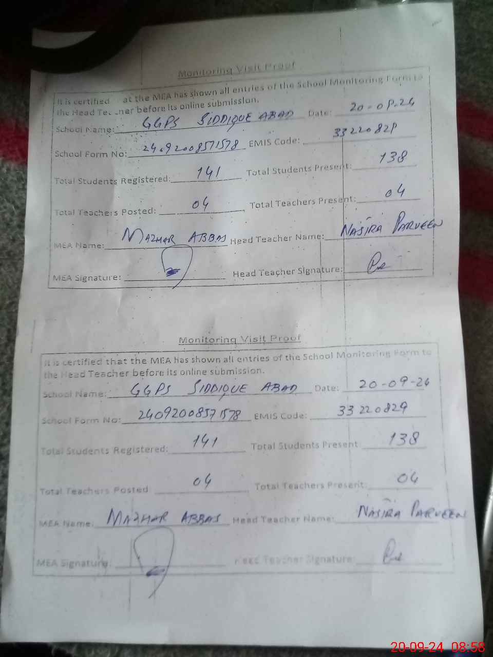 | EMIS Code: 33220829 | Name of School: GGPS SIDDIQUE ABAD | |||