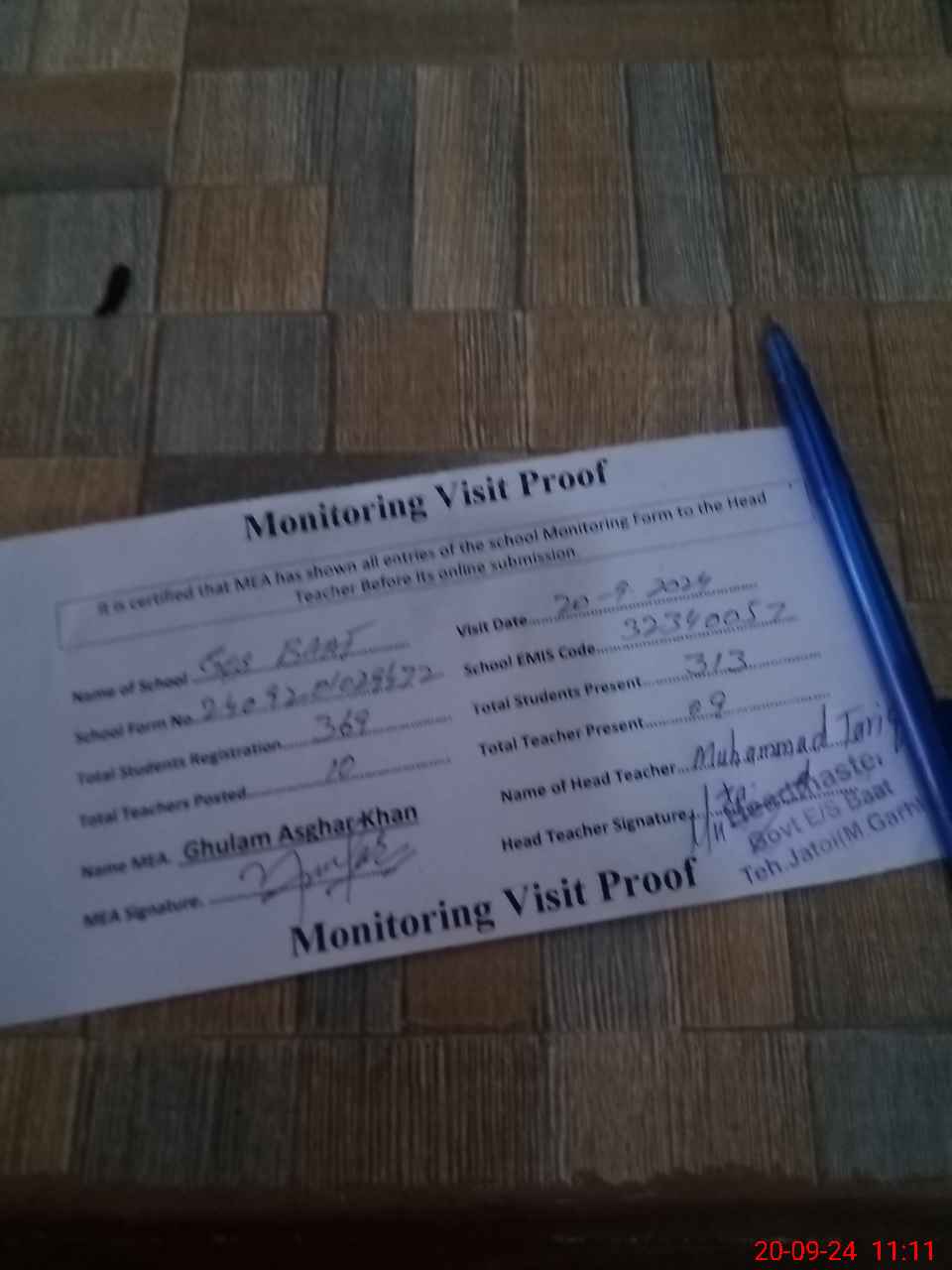 | Attendance Register | Head Teacher | MEA with School | Visit Proof |