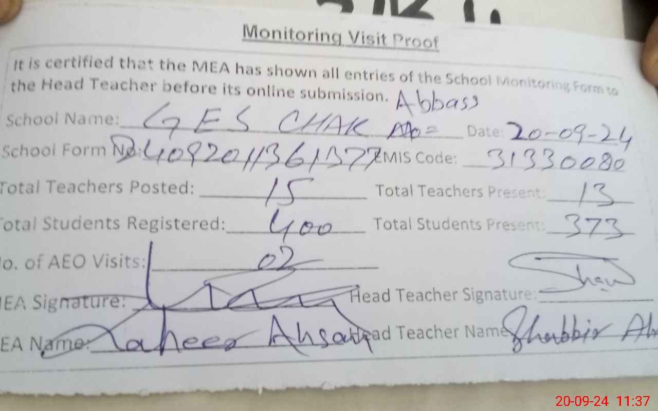 | EMIS Code: 31330080 | Name of School: GES CHAK ABBAS | |||