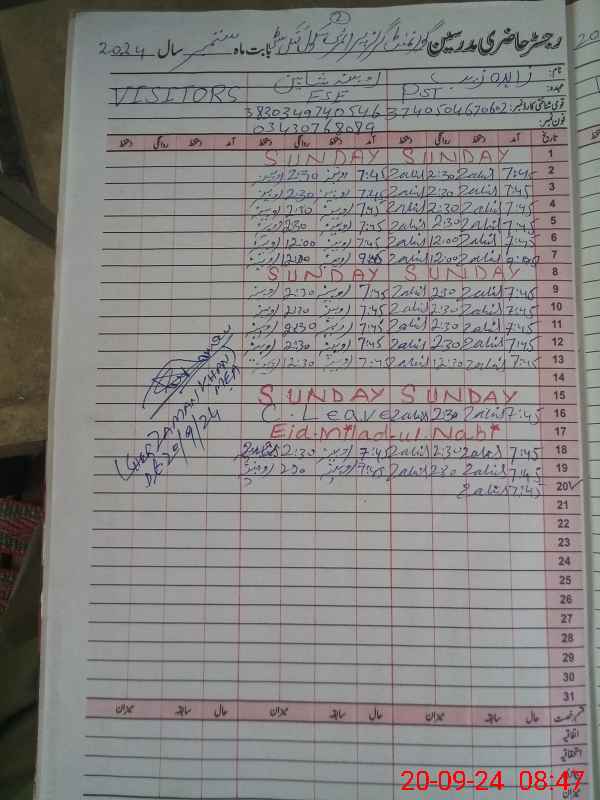 | CNIC | Full Name | Designation | R/C | Absence During Last Calender Month |