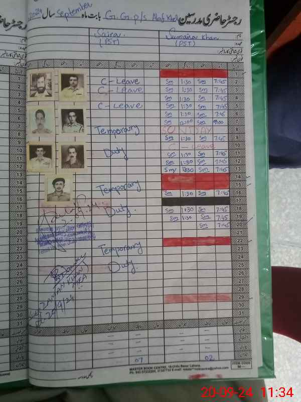 | CNIC | Full Name | Designation | R/C | Absence During Last Calender Month |