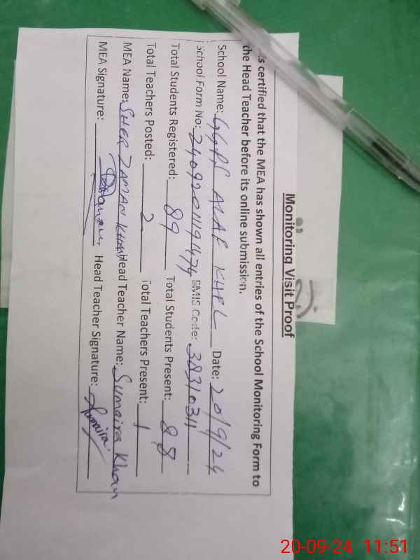 | Total no. of Classrooms: 4 No. of Classrooms Used for Teaching: 4 No. of Classrooms Storing Old Furniture, FTBs, etc: 0Comments if Any: PST SAIRA was unauthorized she was shown on temporary duty but her temporary duty record was was not available in the school |