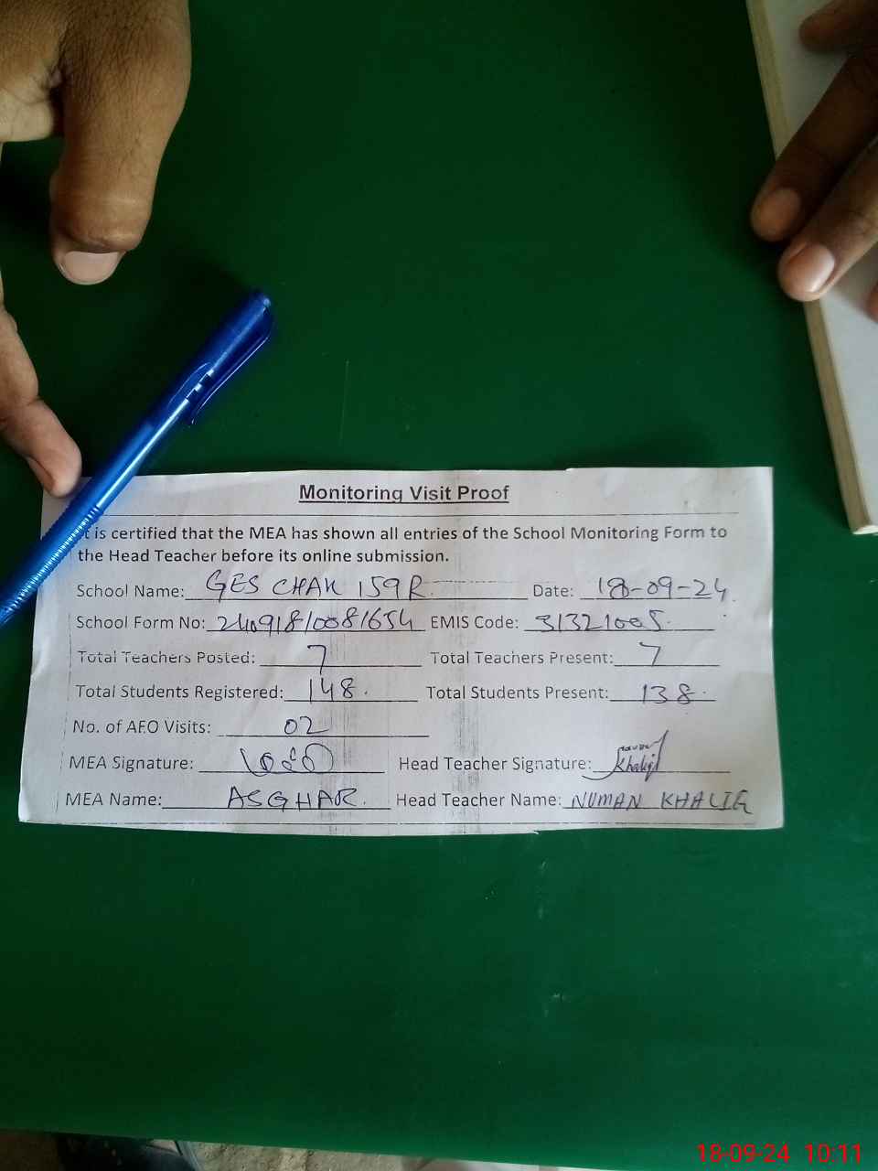 | Attendance Register | Head Teacher | MEA with School | Visit Proof |