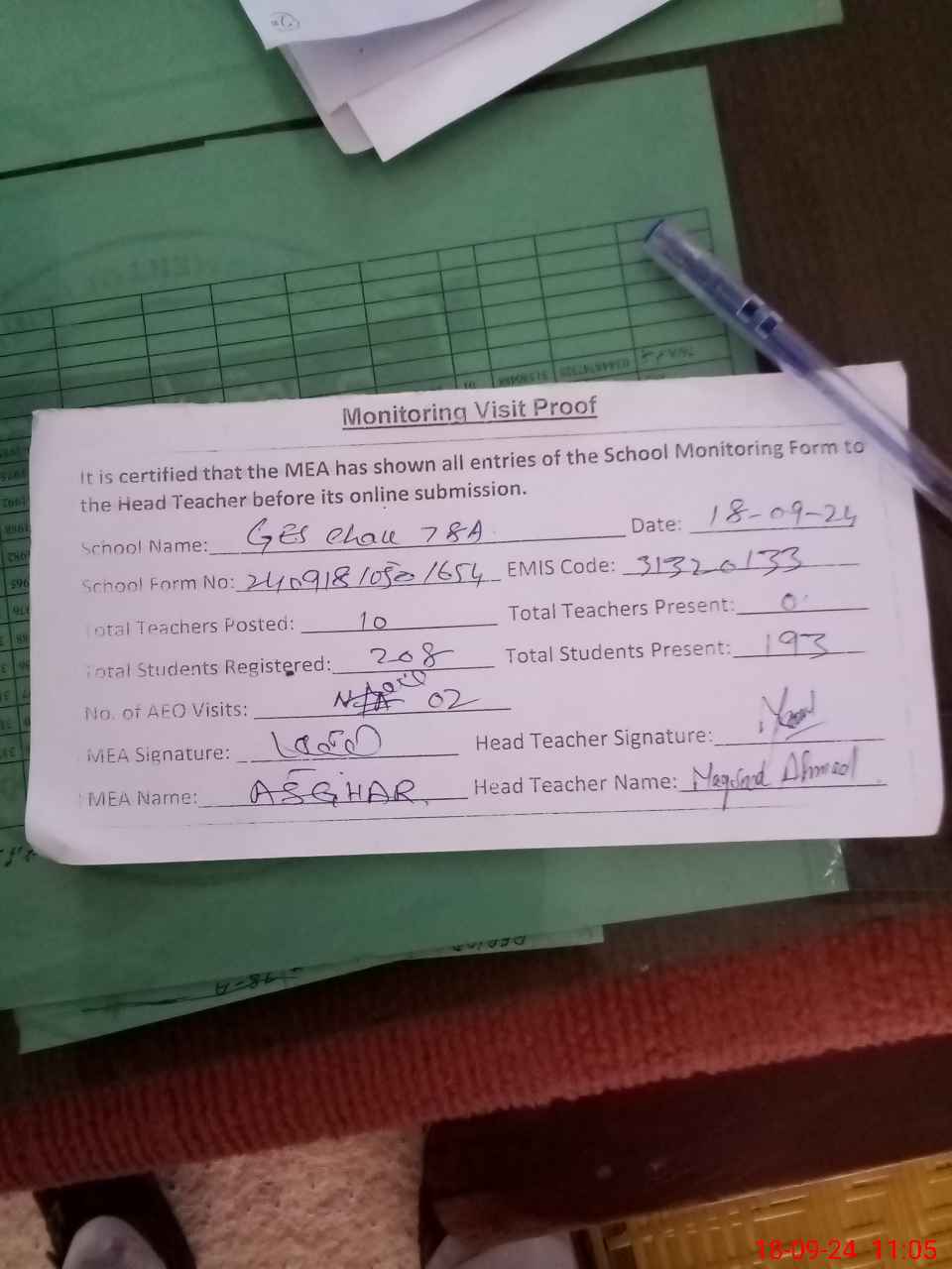 | Attendance Register | Head Teacher | MEA with School | Visit Proof |