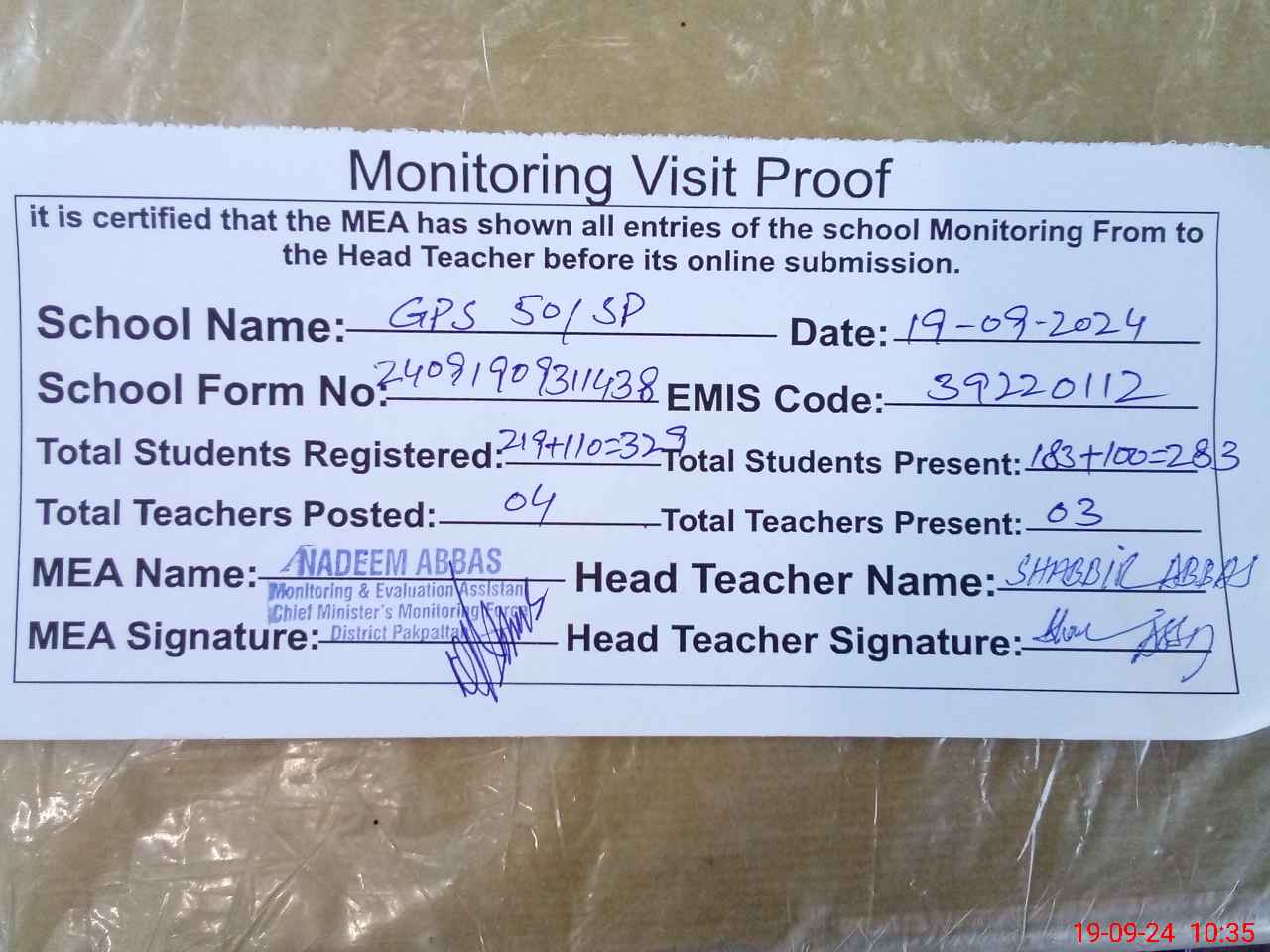 | Certified that this School was Inspected by the Undersigned MEA/DMO Today and the Information Stated Above is as Per Record. | |||||