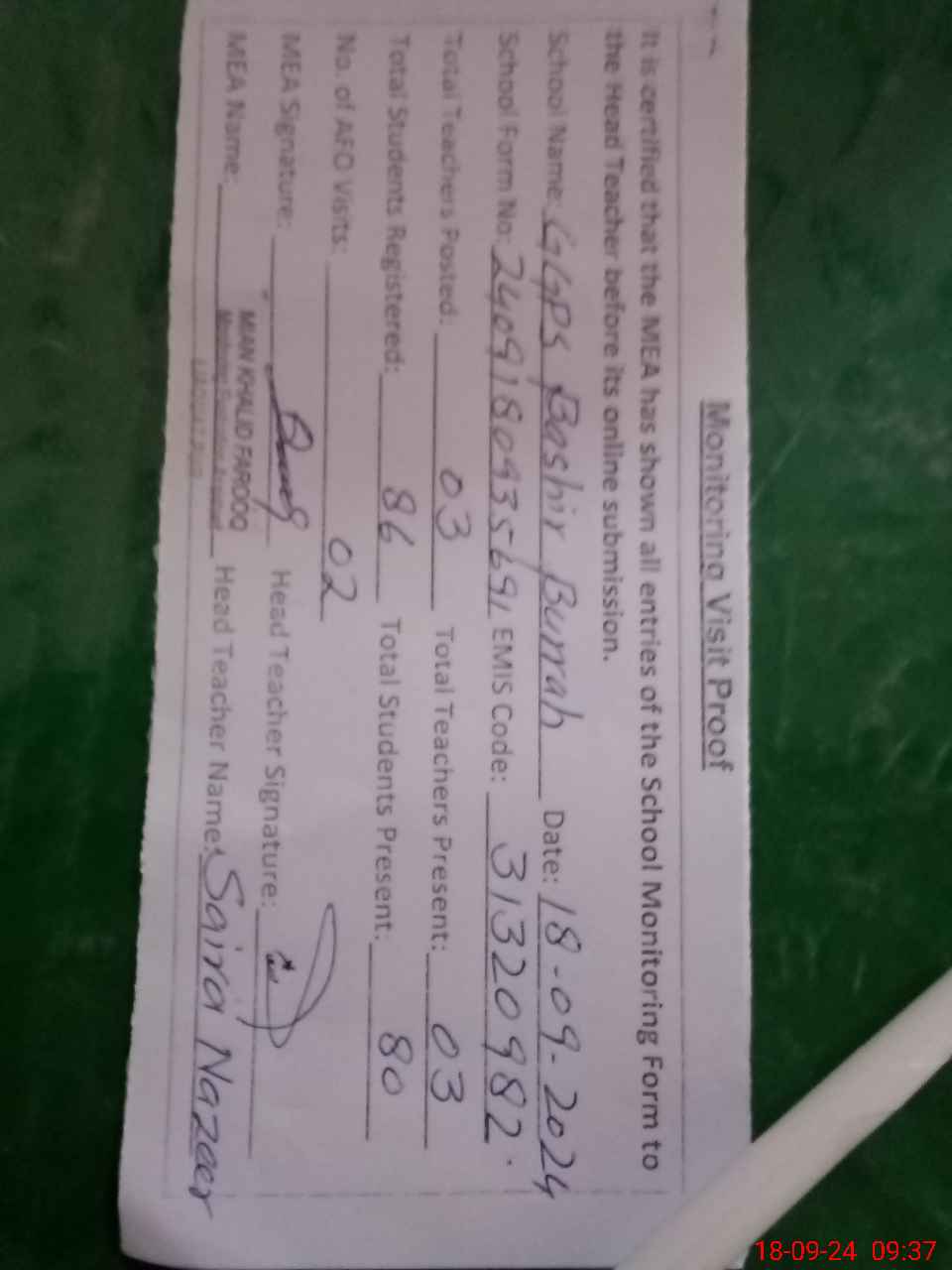 | EMIS Code: 31320982 | Name of School: GGPS JAM BASHIR BURRAH | |||