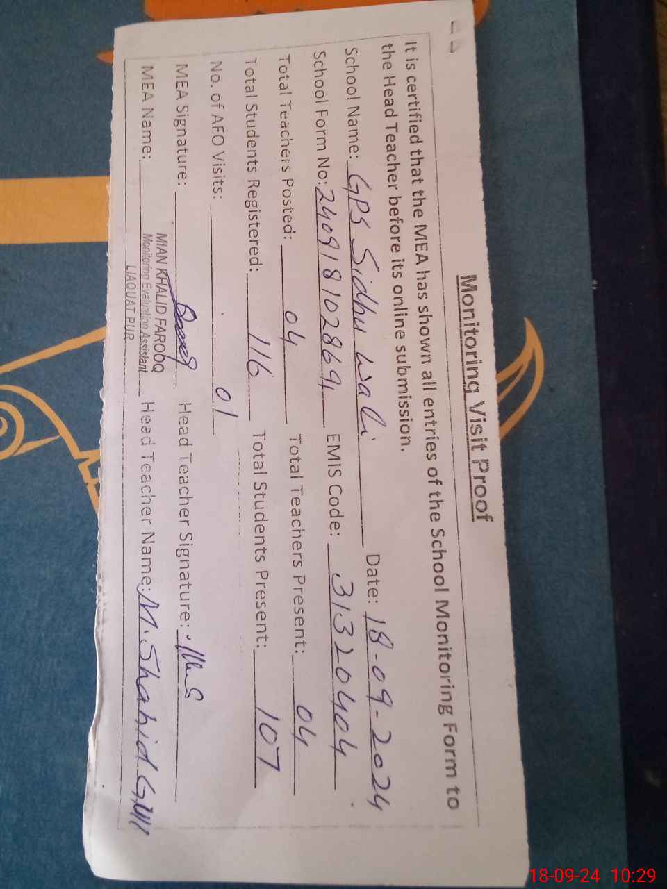 | Attendance Register | Head Teacher | MEA with School | Visit Proof |