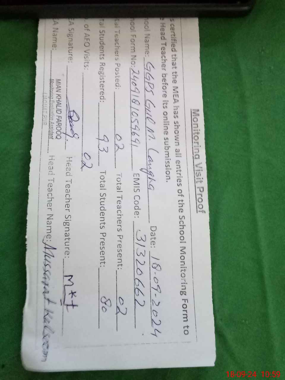 | Attendance Register | Head Teacher | MEA with School | Visit Proof |