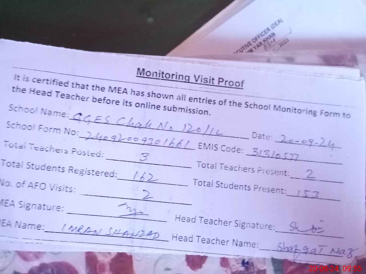 | Attendance Register | Head Teacher | MEA with School | Visit Proof |