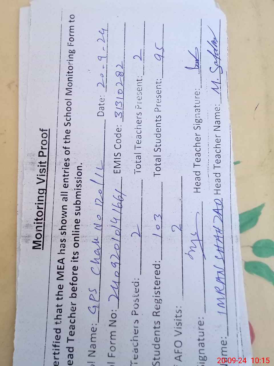 | Attendance Register | Head Teacher | MEA with School | Visit Proof |