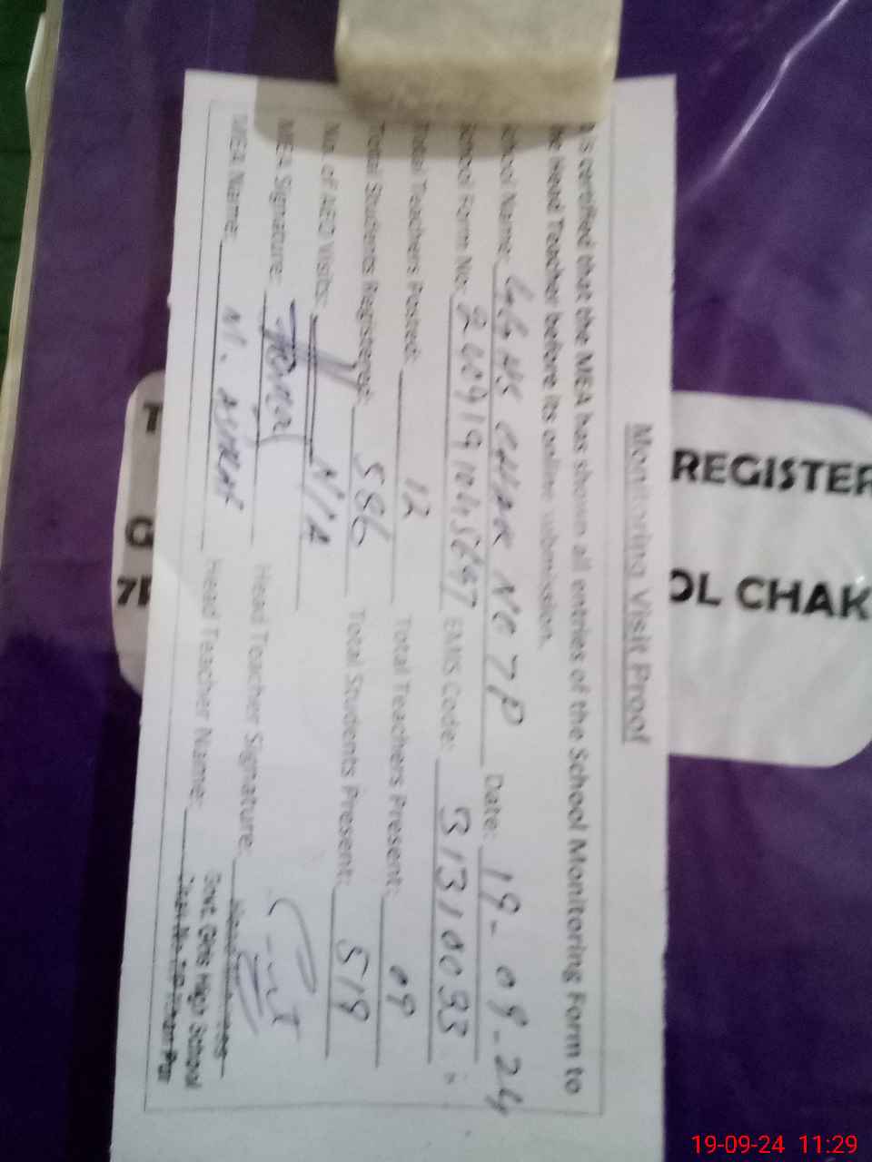 | Attendance Register | Head Teacher | MEA with School | Visit Proof |