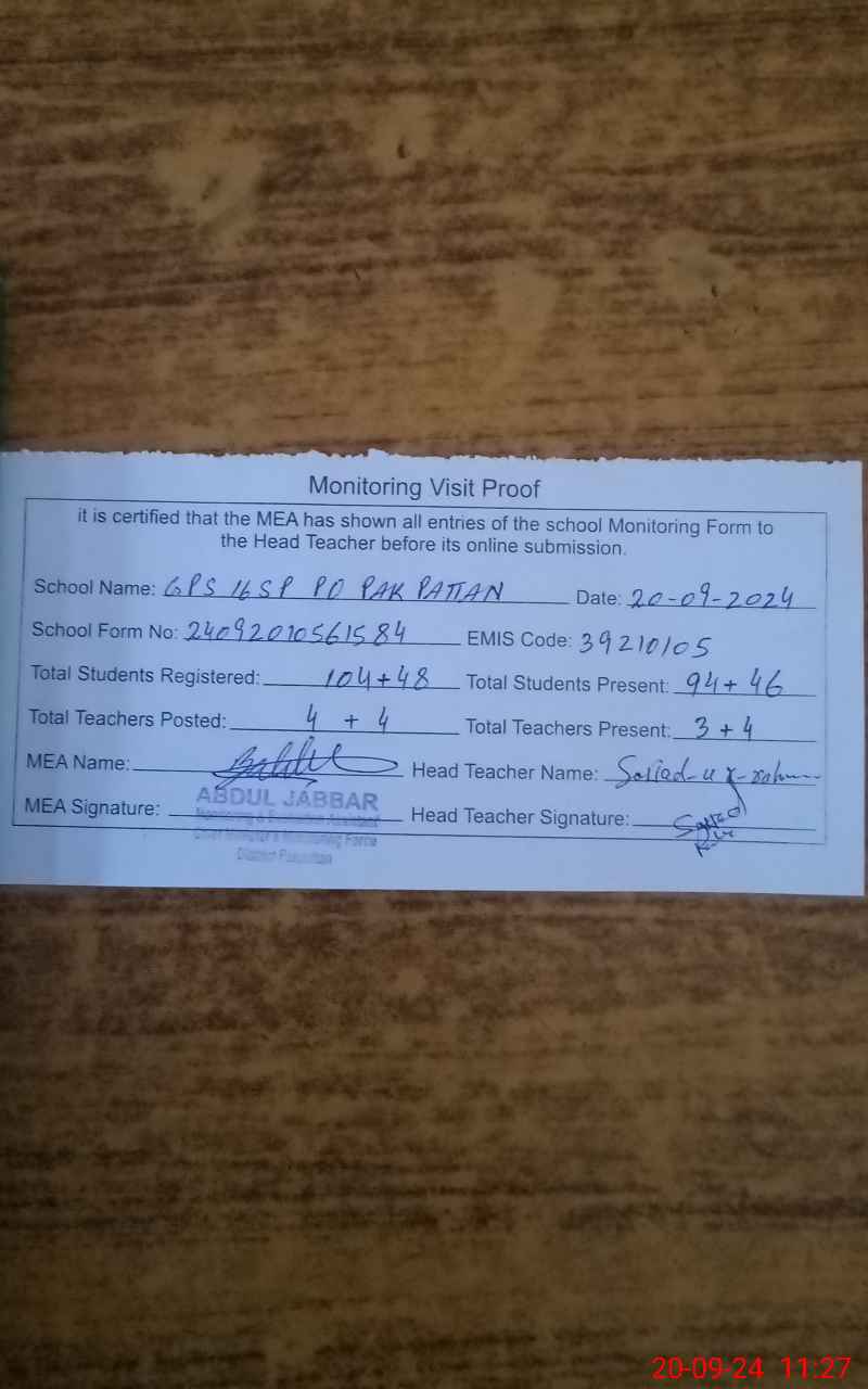 | EMIS Code: 39210105 | Name of School: GPS 16/SP PO PAKPATTAN | |||