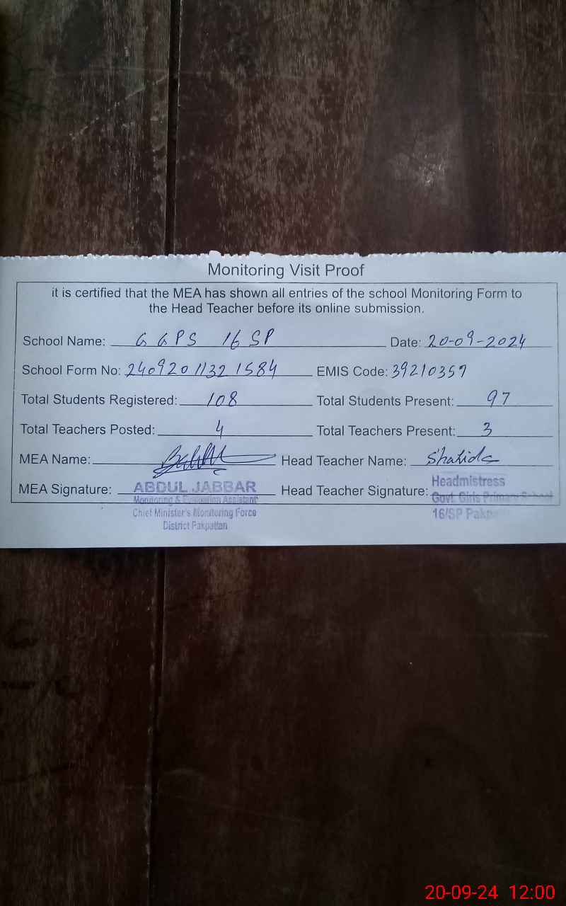 | EMIS Code: 39210357 | Name of School: GGPS 16 SP | |||
