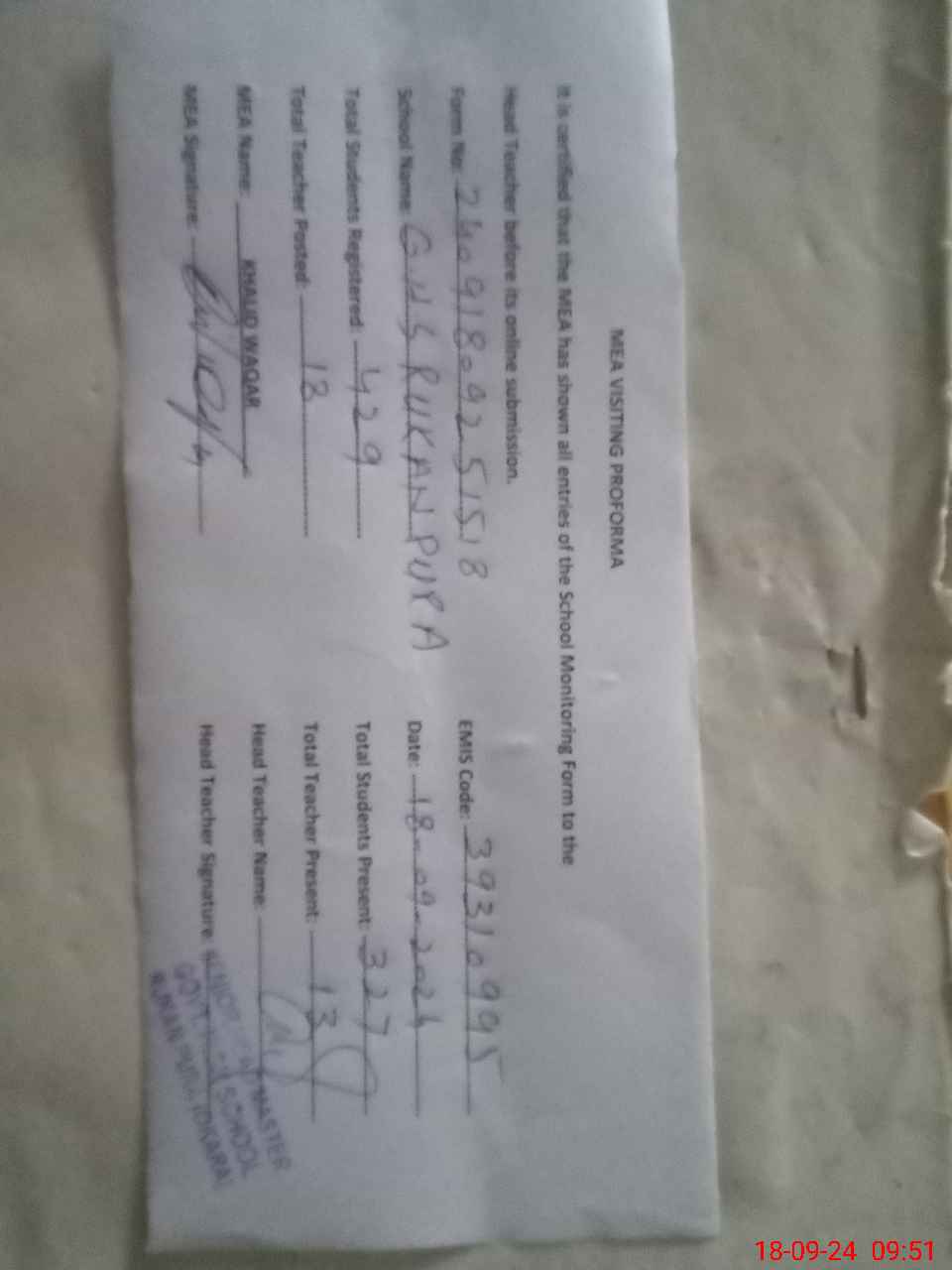 | Monitoring Date: 18-09-2024 | Start Time: 18-09-2024 09:01 AM | End Time: 18-09-2024 09:55 AM | Name of MEA: KH**** WA**** | |