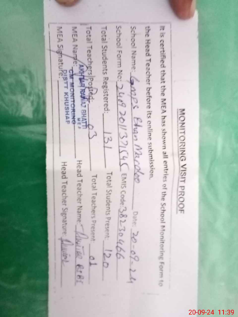 | Attendance Register | Head Teacher | MEA with School | Visit Proof |