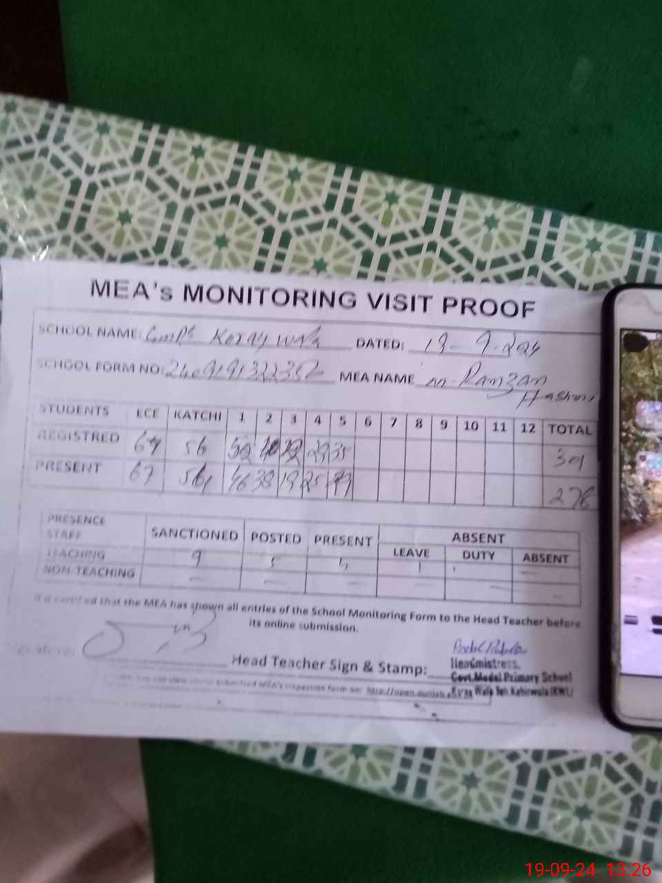 | Attendance Register | Head Teacher | MEA with School | Visit Proof |