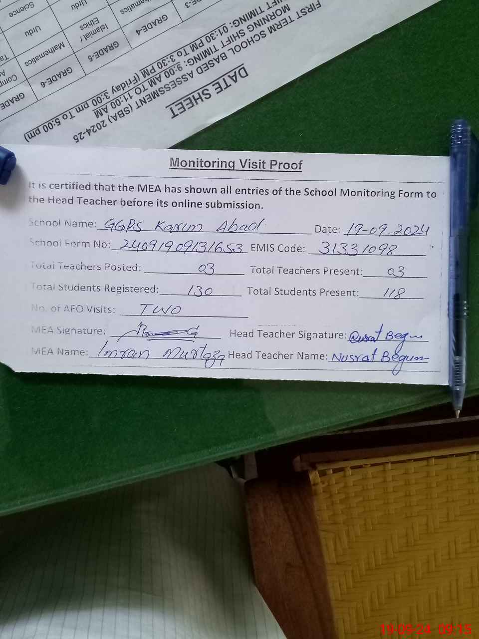 | Attendance Register | Head Teacher | MEA with School | Visit Proof |