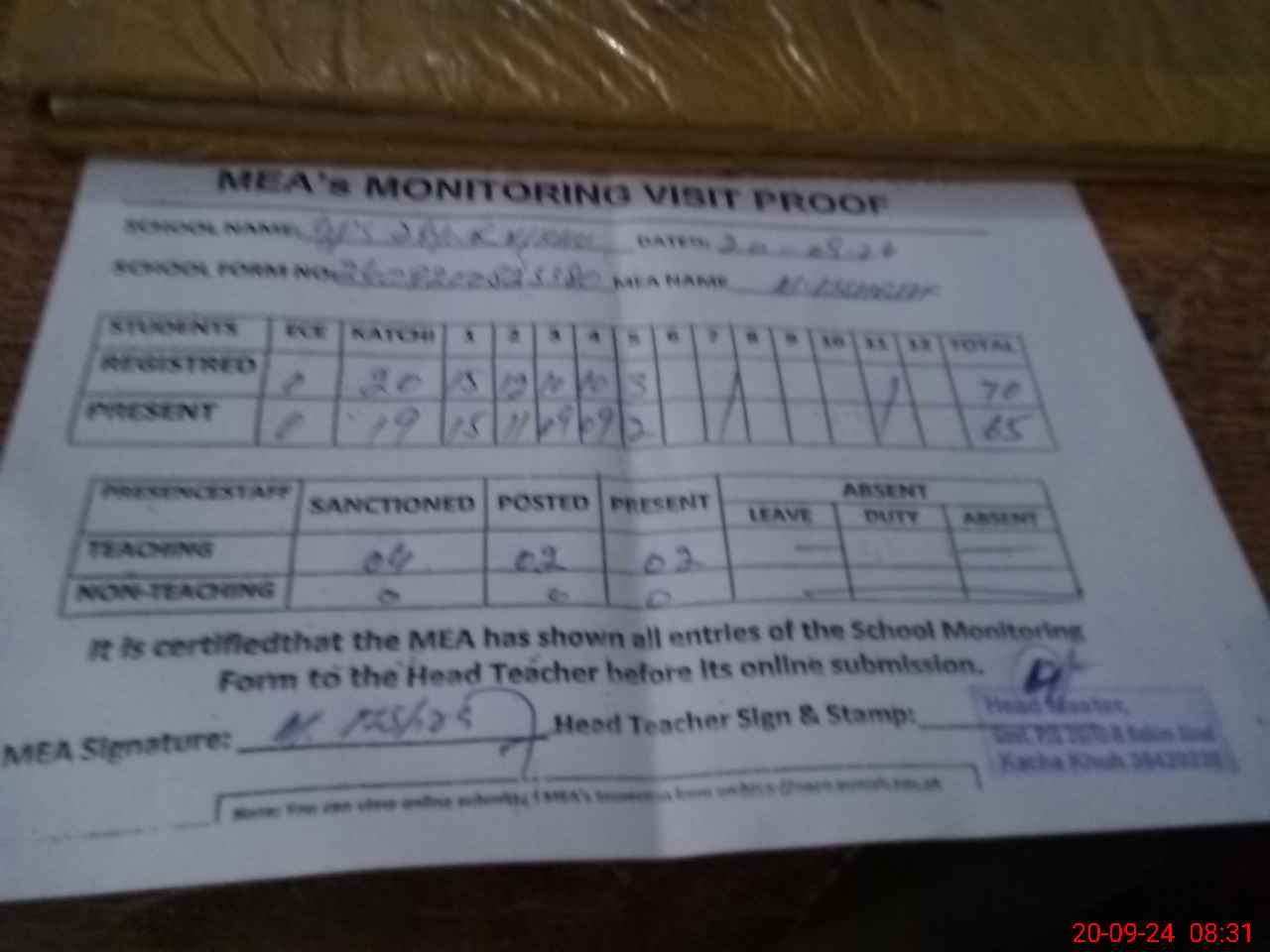 | Attendance Register | Head Teacher | MEA with School | Visit Proof |