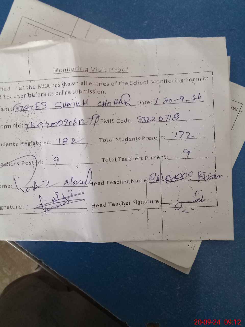 | Attendance Register | Head Teacher | MEA with School | Visit Proof |