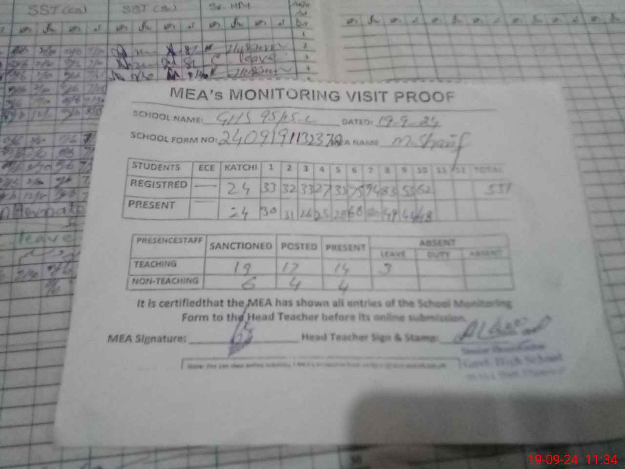 | Attendance Register | Head Teacher | MEA with School | Visit Proof |