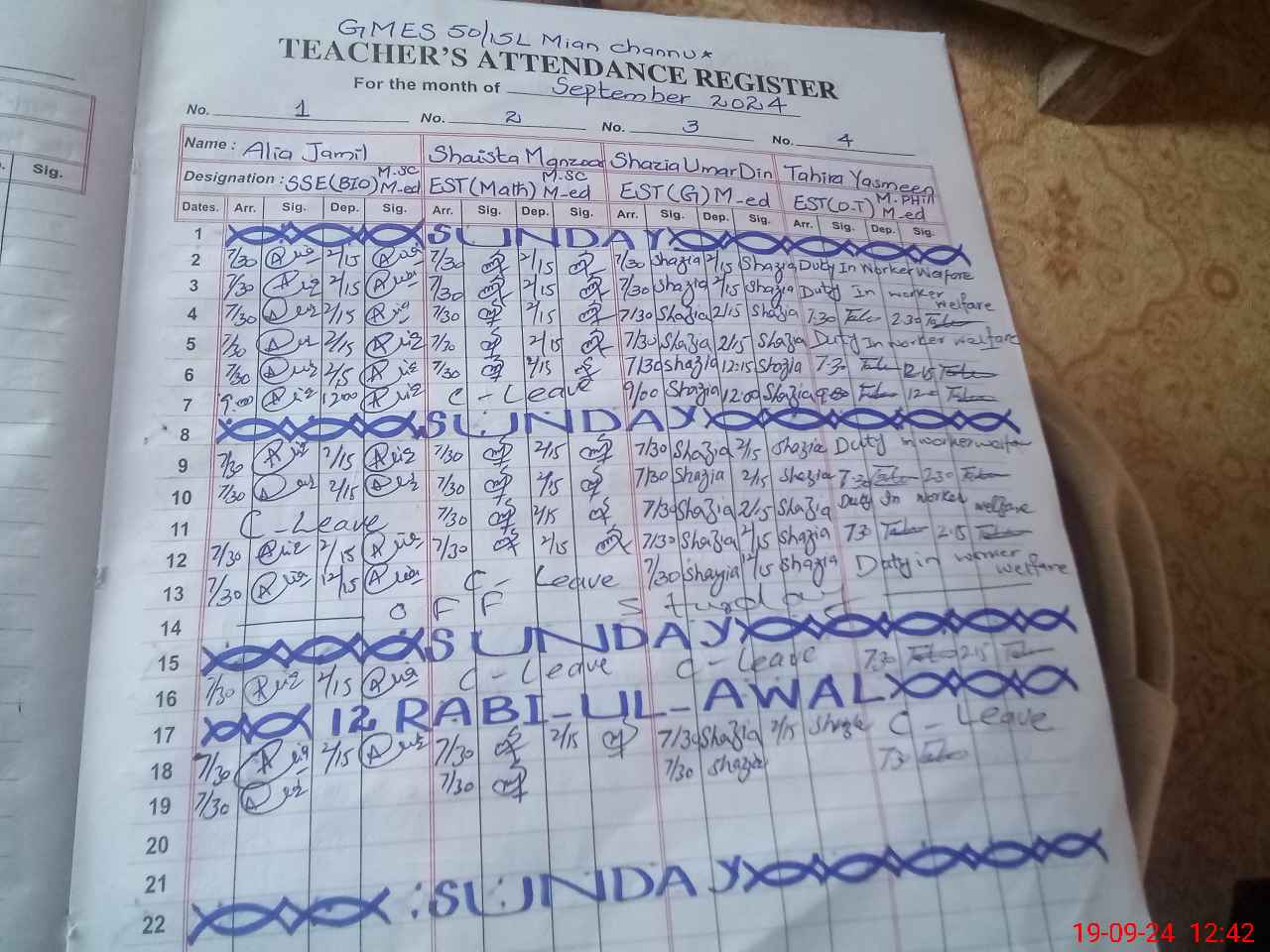 | CNIC | Full Name | Designation | R/C | Absence During Last Calender Month |