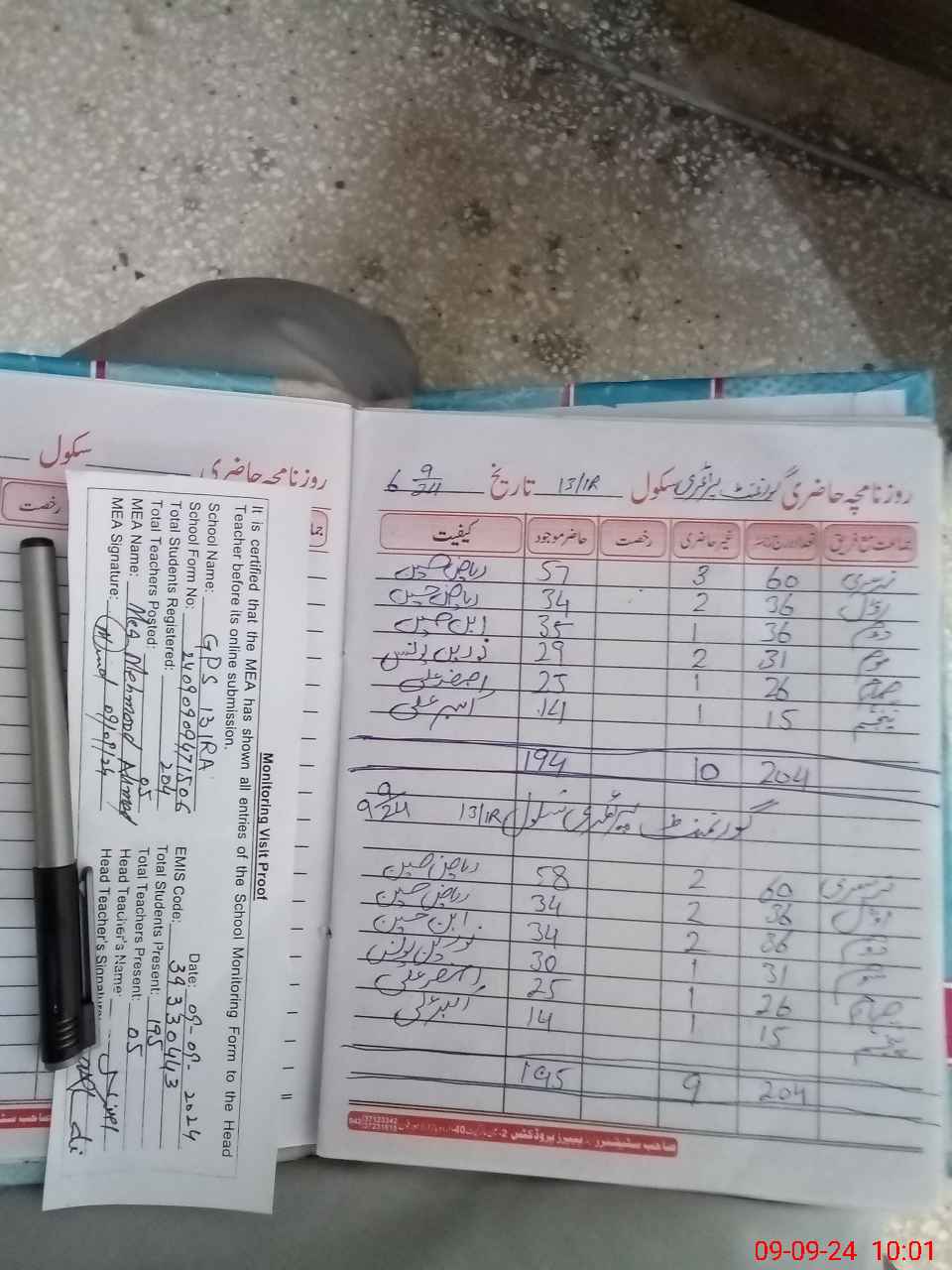 | Attendance Register | Head Teacher | MEA with School | Visit Proof |